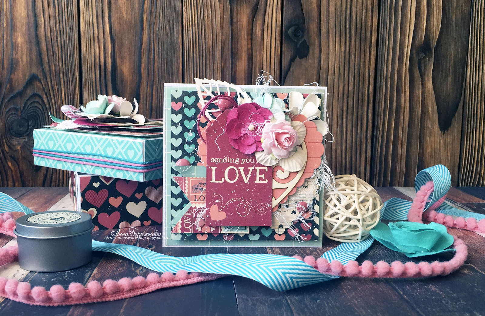 По заданию у меня сложился комплект: коробочка для небольшого, но приятного подарка на День всех влюбленных и открытка к ней в пару для активной и веселой девушки. Наша героиня любит сочные цвета и не любит "кружавчики". Романтичный, но не приторный, веселый и яркий, - вот каким должен быть подарок по словам её молодого человека. За романтику у меня отвечают сердечки и слова "Love", за яркость и веселье - сочетание розового, красного и бирюзы.