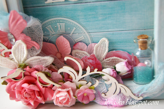 Использовала: бумагу из набора "Бесценные моменты", краску акриловую голубую и белую, чипборд, цветы плоские, цветы тканевые, розы, бутоны роз, марлю, украшение "Часы", стеклянную баночку, бусинки, микробисер.