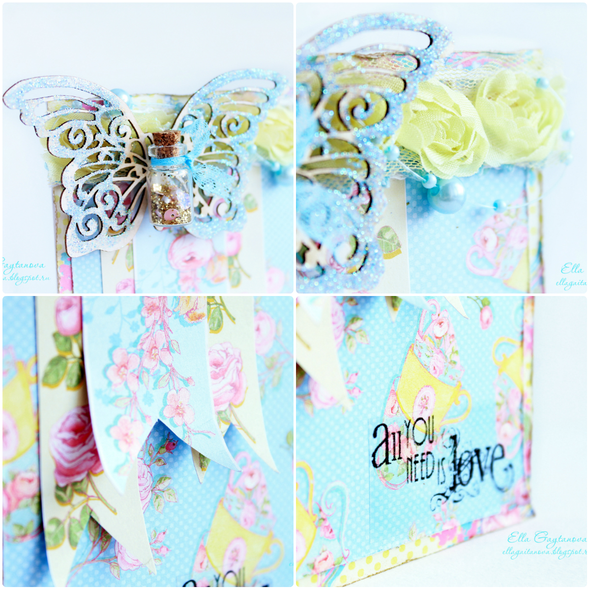 Использовала бумагу Каралики Summer Love, паетки, кальку, чипборд.