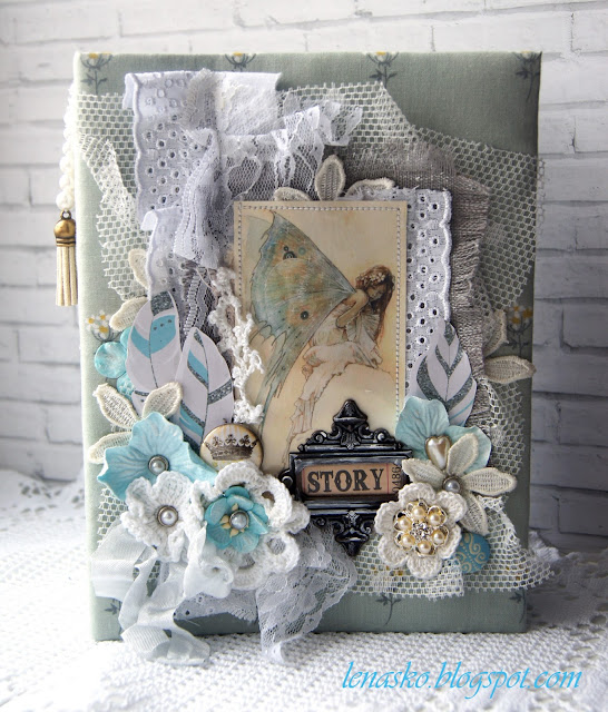 Использовала пивной картон, разъемные колечки, хлопковую ткань, проложенную синтепоном, на обложке кружево, лента-плиссе, цветочки, шебби лента. Также пригодился установщик люверсов.