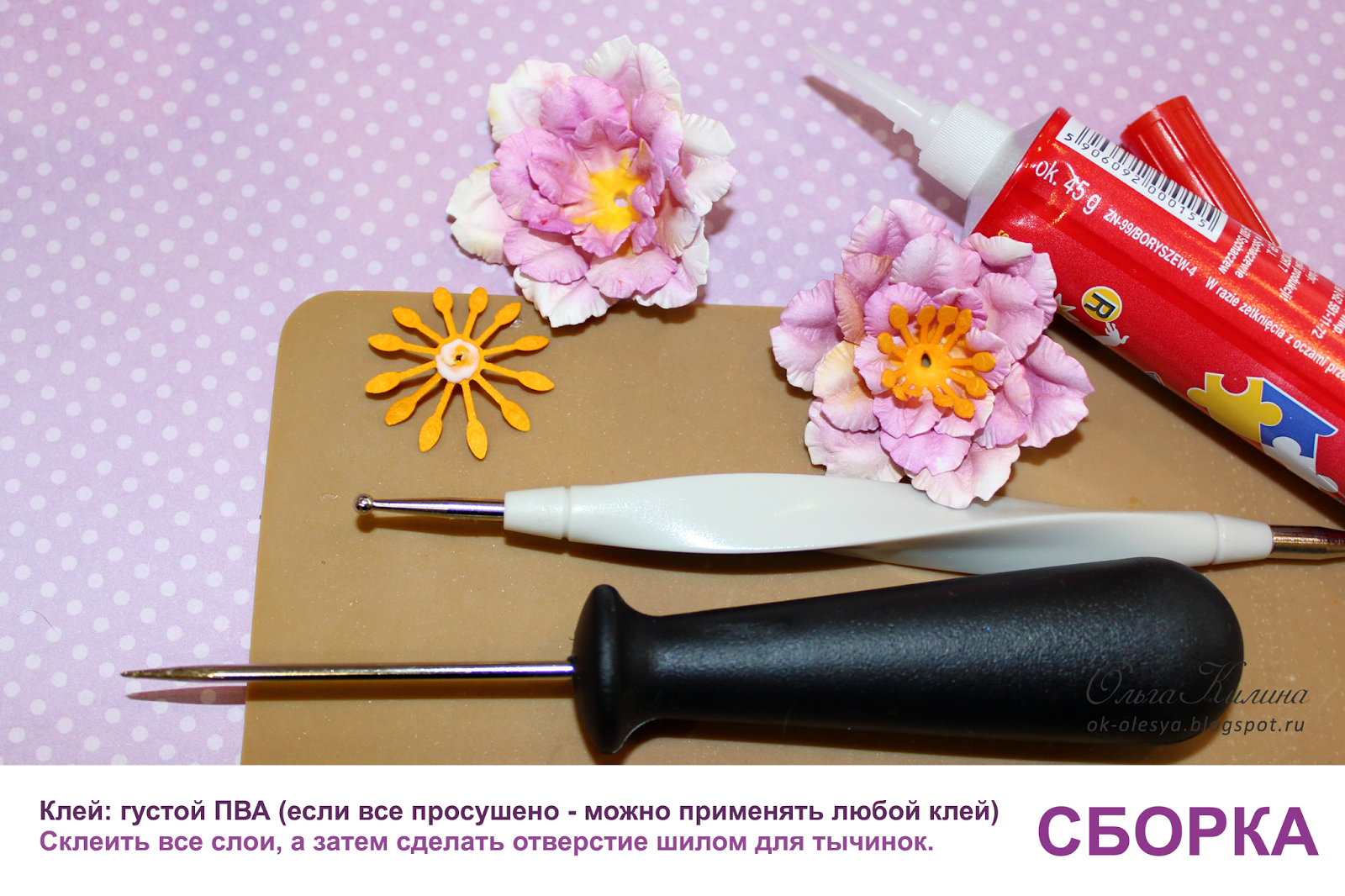 6. Для сборки применяю густой ПВА - напр, "Момент" Столяр 3D SuperPVA. Склеиваю и сразу делаю отверстие шилом, чтобы затем вставить пестики-тычинки.