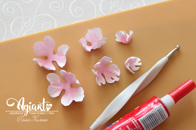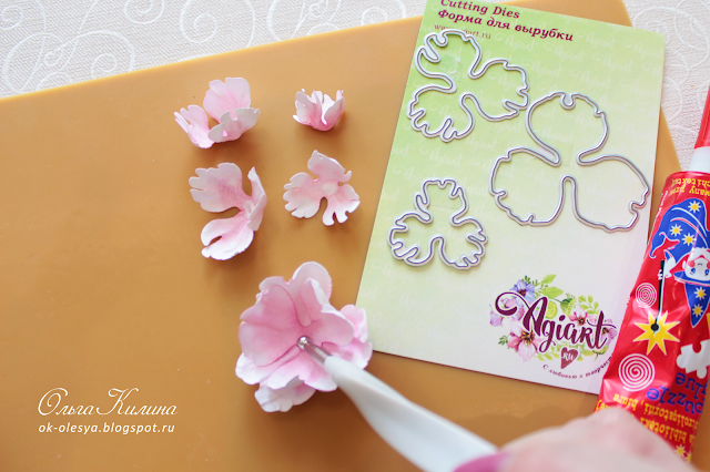3. ТИСНЕНИЕ. Пока заготовка влажная, тисню лепестки на мягком резиновом коврике с помощью бульки 5 мм (палочки для тиснения с металлическим шариком на конце). Провожу булькой с небольшим нажимом от верхушки к центру цветка, сначала по краям, потом по центру. Лепесток загибается и выглядит естественно.