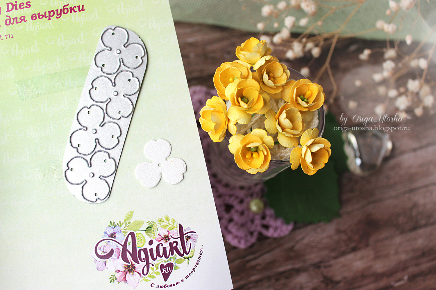 Для изготовления лютиков я использовала тоже новые ножи "Мелкоцвет №1", каждый цветочек собран из трех элементов вырубки.