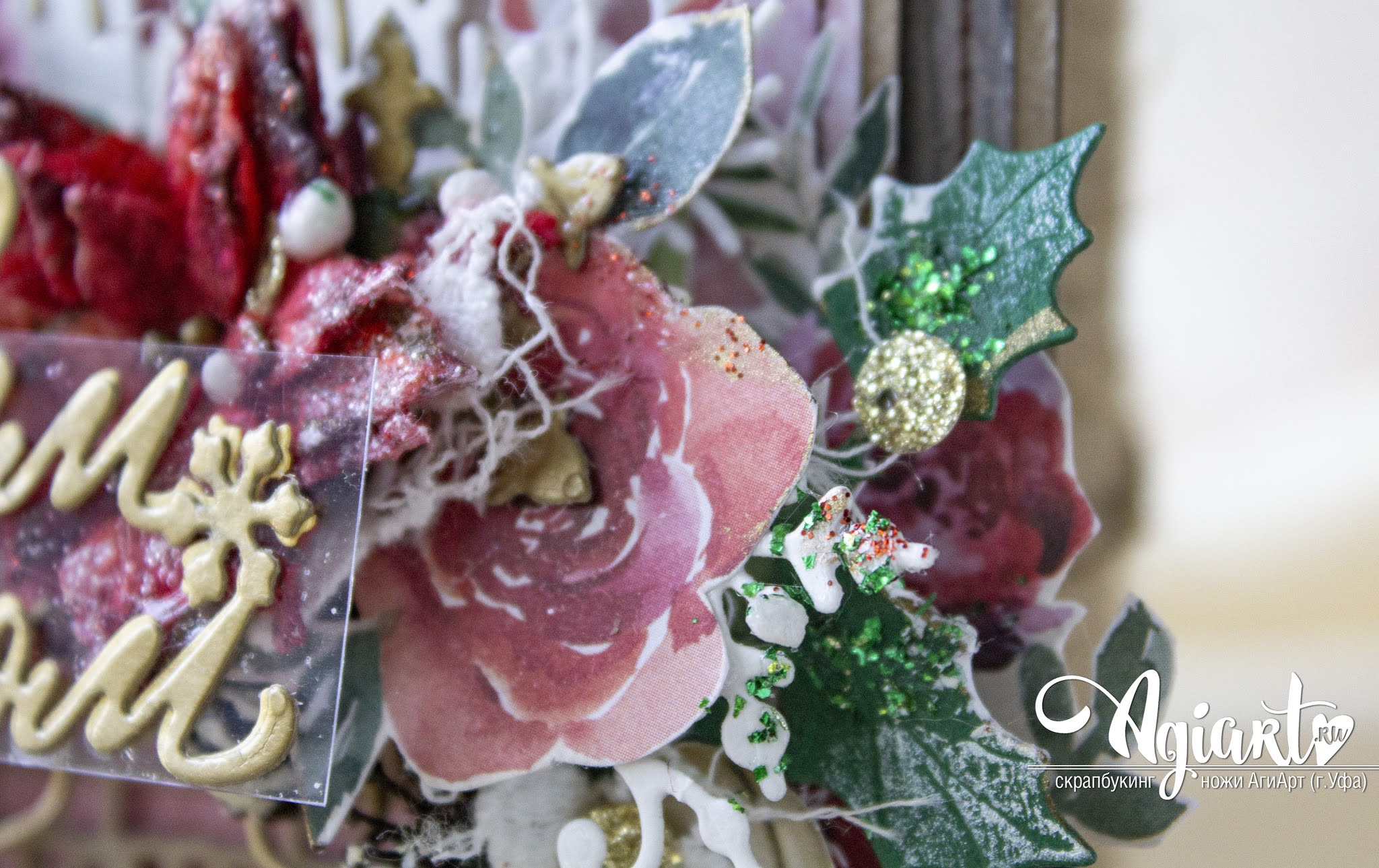 Все мы зачастую видим зиму в двух цветах - это голубая гамма и классическая красно-зеленая. Я решила сразу две сделать. В голубой гамме главным элементом выступили часы с рождественскими свечами. Все это я приправила цветами и надписью