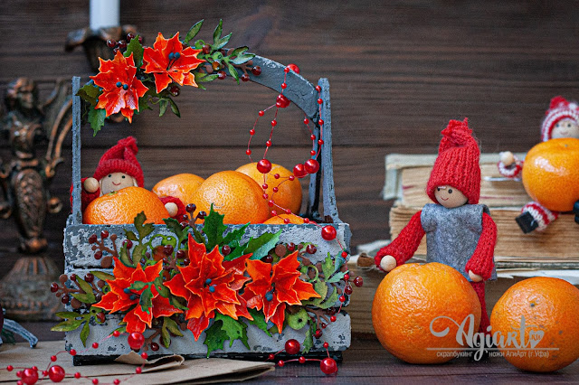 Оранжевый Новый год? Почему бы и.. ДА! Конечно это не совсем привычная нам палитра для Рождественских праздников, но какими еще должны быть пуансеттии на ящичке с мандаринами?