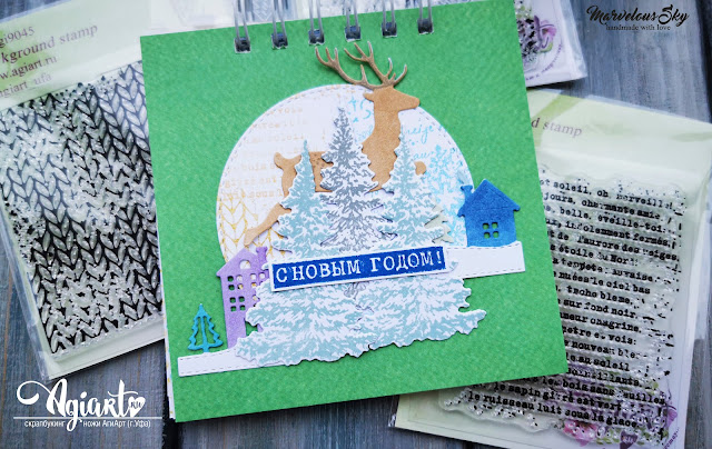 Елку, надписи и фон я штамповала с помощью дистресс чернил. А дома я раскрасила маркерами. Надписи на страницах приклеены на объемный скотч. Мне кажется, получился прекрасный альбом с теплыми пожеланиями.