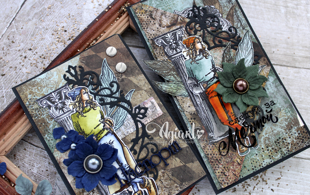 Штампы раскрашены дистрессами, а отштамповки сделаны на окрашенной акварельной и скрапбумаге.